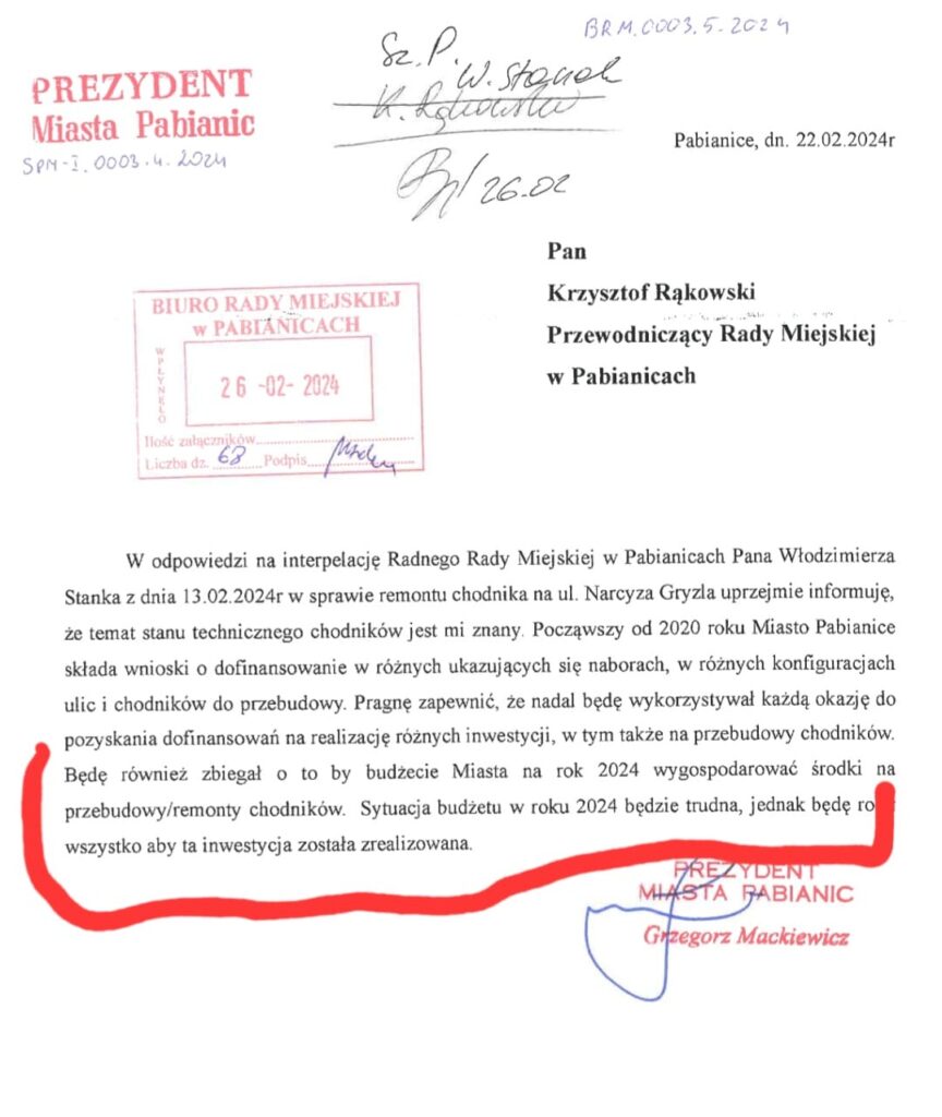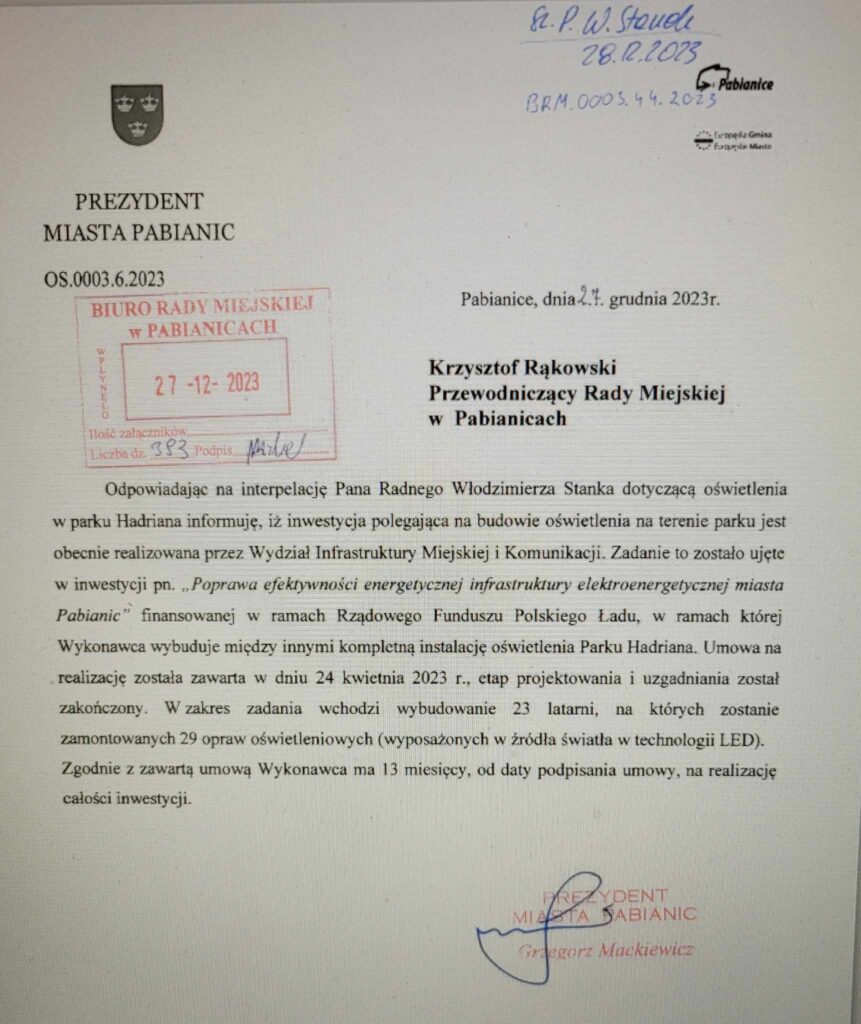 Odpowiedź Prezydenta i „obietnica” realizacji jeszcze w 2024 roku … poczekamy, zobaczymy.