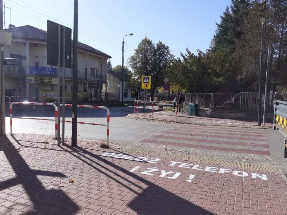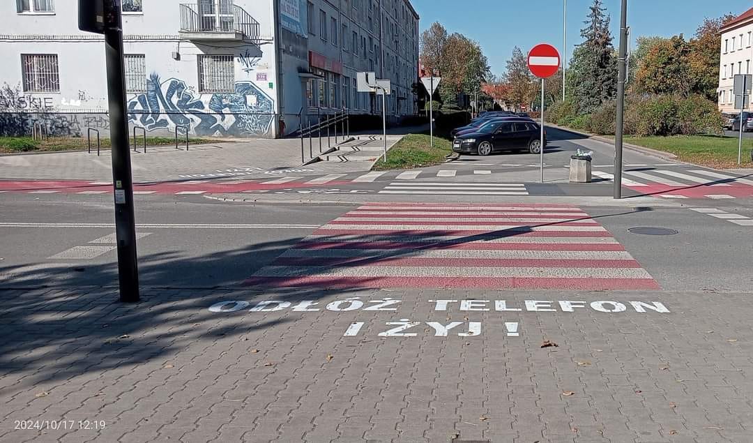 Wczoraj Zarząd Dróg Miejskich wybrane przejścia dla pieszych przy ul. Zamkowej oznaczył napisem „Odłóż telefon i żyj „